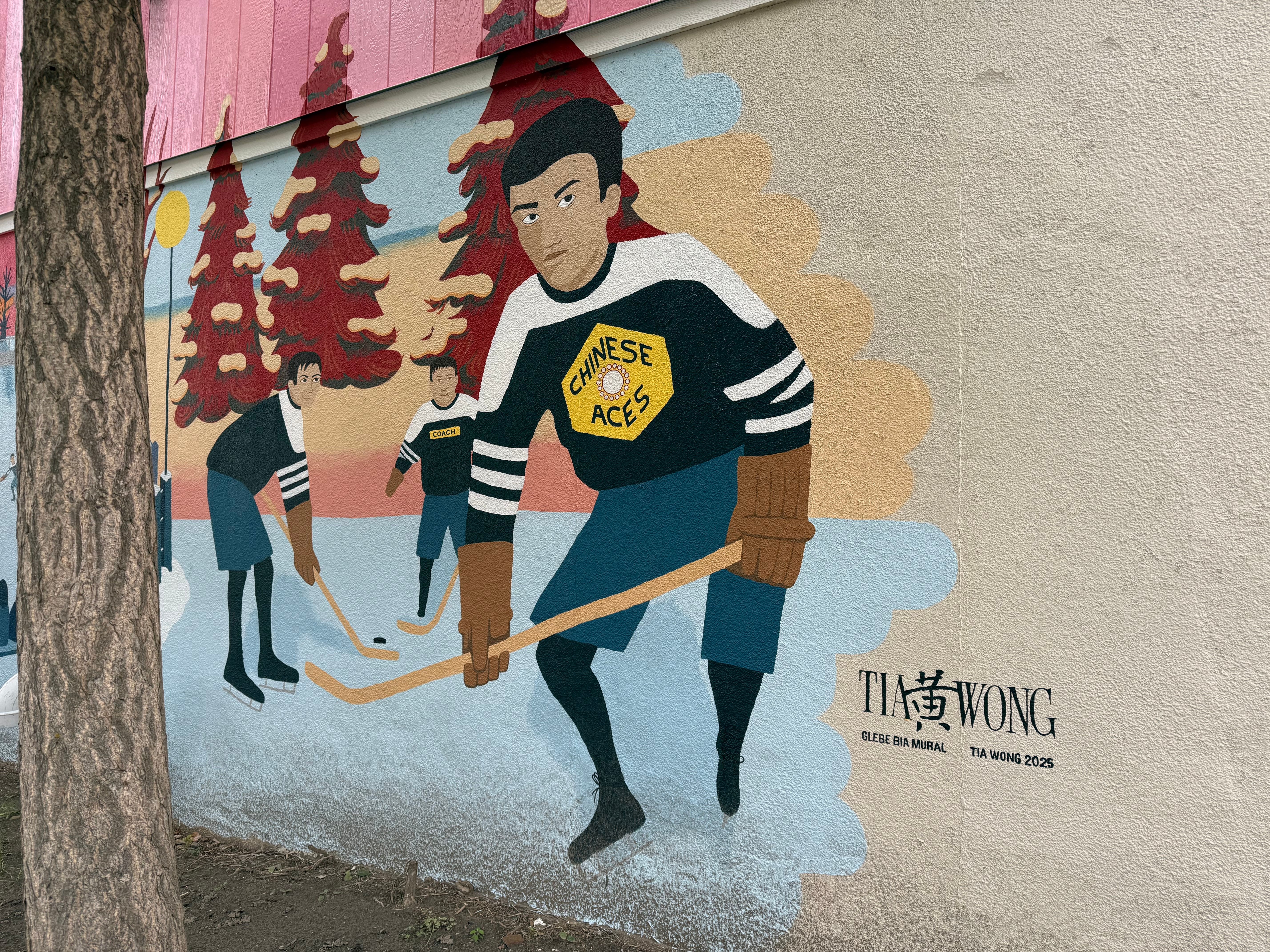Tia Wong represents this story with pride through “Chinese Aces Skate the Canal”. The hope is that it encourages viewers to learn about and appreciate the diversity of people who have made the Glebe what it is today. Tia took inspiration from Canadian artists in this mural, such as the Group of Seven, and commercial works like old designs for Tim Horton’s cups and the five-dollar-bill. These references help evoke a feeling of nostalgia for the idyllic scene illustrated in this 30 foot piece. While embracing the past, however, Tia’s ultimate goal is to remind people of what the community stands to lose as we face the impacts of climate change.