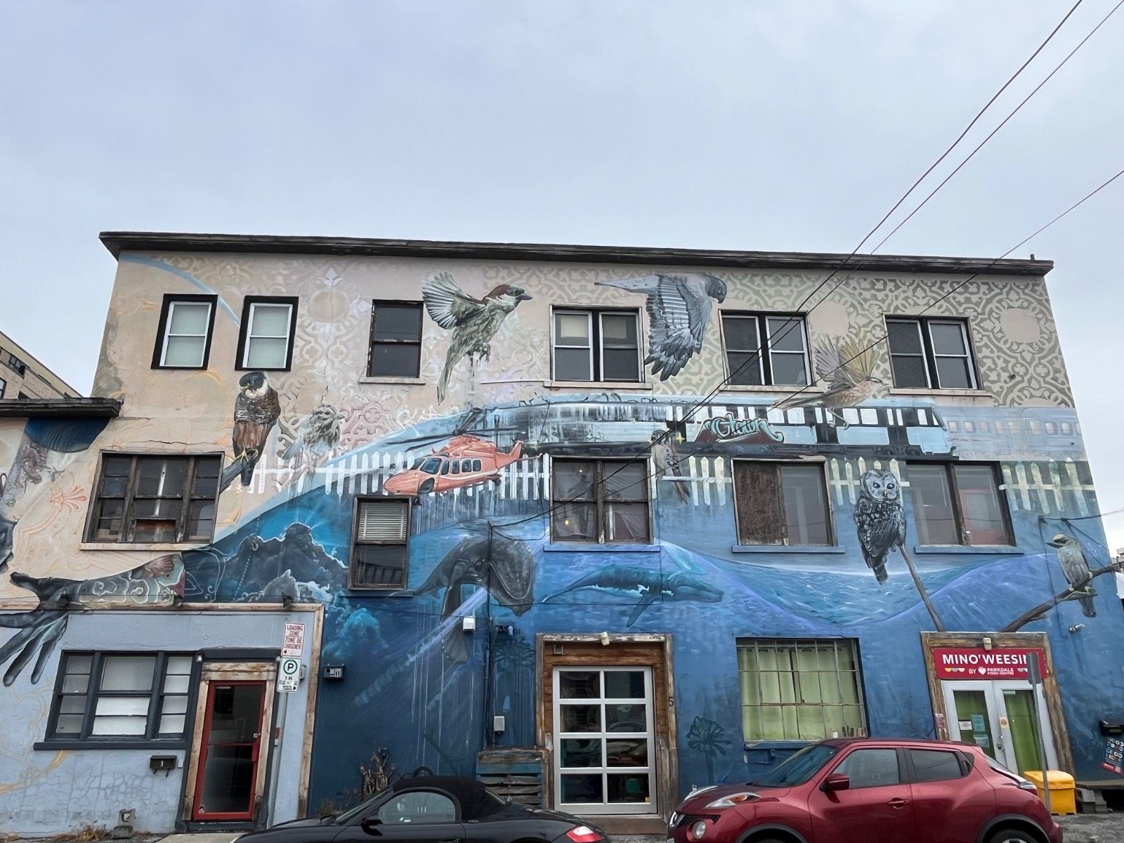 La fresque murale réalisée par l'artiste montréalais Arpi au 3 Hamilton Avenue est un hommage spécifique au site, conçu pour créer des liens entre des inconnus et capturer l'essence de la communauté environnante de Hintonburg. Au centre du dessin se trouvent les immenses « mains de Dieu », inspirées du bras tatoué d'Alex Neron, propriétaire de Railbender, qui tiennent délibérément un pistolet à tatouer dans une main et une gomme à crayon dans l'autre. Cette base personnelle est enrichie d'une iconographie urbaine, notamment un train et des rails qui reflètent la passion d'Arpi pour les chemins de fer, la culture du graffiti et l'histoire du quartier, ainsi qu'un visage géant inspiré d'un dessin original de Neron. Malgré le défi technique que représentent les nombreuses fenêtres du mur, la fresque s'intègre parfaitement à la culture du quartier, avec des moineaux (un clin d'œil aux motifs naturels de l'artiste et au projet local Hintonbird House) et une clôture unique qui fait référence à la brasserie voisine Beyond the Pale, symbolisant l'ouverture à laquelle Arpi aspire.