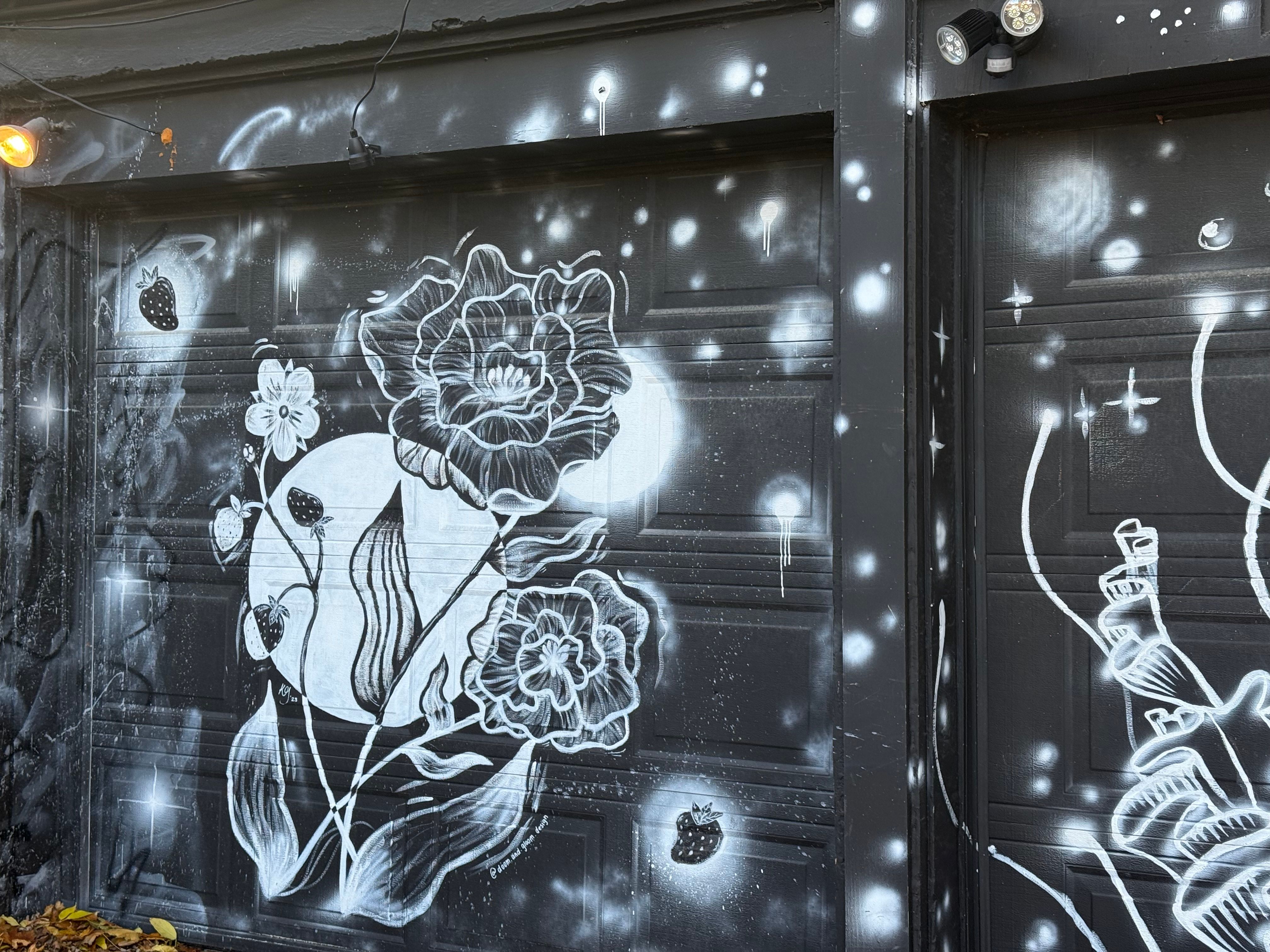 Réalisée à l'aérosol noir, blanc et gris, cette fresque murale transforme une porte de garage en une toile céleste. Elle représente une fleur centrale et des fraises éparpillées, rendues avec un contraste élevé et des effets de lumière qui confèrent à l'image un aspect éthéré, presque étoilé.